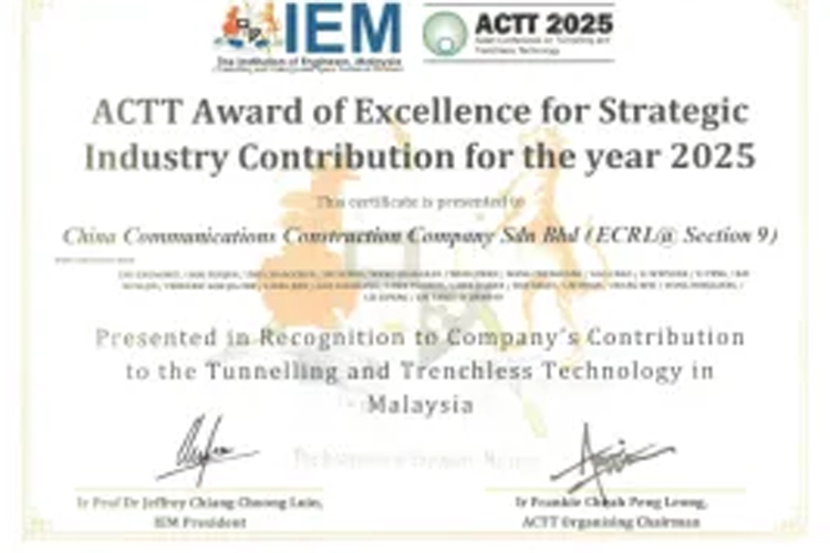 Recentemente, o Projeto da Ligação Ferroviária da Costa Leste da Malásia (ECRL) construído pela CCCC recebeu o "Prémio de Excelência em Inovação de Engenharia ASEAN 2025" da Primeira Conferência ASEAN-China de Inteligência Artificial e o "Prémio de Contribuição Excelente 2025" da Conferência de Túneis da Ásia 2025 (ACTT).