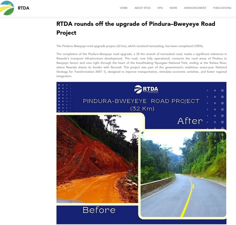 A estrada está localizada na floresta de Nyungwe, conectando a cidade de Pindura à cidade de Bweyeye. Sob condições climáticas extremas, terreno complexo e rigorosas restrições ambientais, o projeto superou com sucesso os desafios da construção através de processos inovadores e gestão detalhada. O projeto aperfeiçoou a rede rodoviária nacional, melhorou significativamente as condições de transporte local e trouxe mais oportunidades de desenvolvimento para as comunidades ao longo da rota, sendo um modelo de coexistência harmoniosa entre infraestrutura, proteção ecológica e desenvolvimento comunitário.