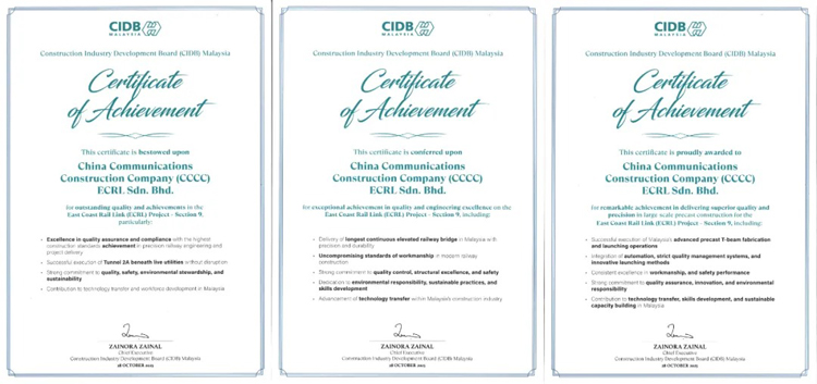 Ao mesmo tempo, na Conferência Internacional de Transformação da Indústria da Construção da Malásia realizada em Kuala Lumpur, a Nona Divisão do Ligação Ferroviária da Costa Leste da Malásia (ECRL) conquistou três Prêmios de Engenharia de Qualidade da Autoridade de Desenvolvimento da Construção da Malásia (CIDB), tornando-se o foco do evento.
