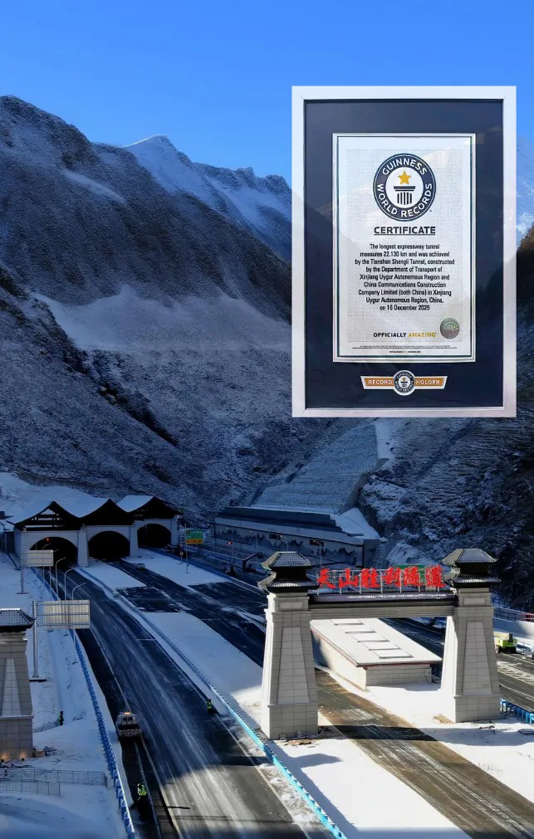 Recentemente, o túnel TianShan Shengli, um projeto estratégico da rodovia Urumqi–Yuli, investido, construído e operado pelo CCCC, foi certificado pelo Guinness World Records como o "Túnel Rodoviário Mais Longo do Mundo", com um comprimento de túnel único de 22,13 km. Esta honra destaca a tecnologia avançada e a capacidade robusta do CCCC na construção de túneis ultra-longos em condições geológicas complexas de alta altitude e clima frio.